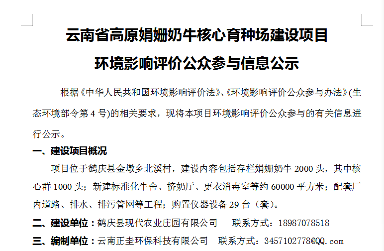 云南省高原娟姍奶牛核心育種場建設項目 環境影響評價公眾參與信息公示